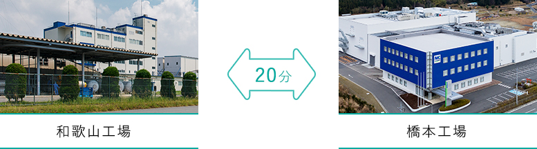 製造部門の主要拠点である和歌山工場・橋本工場は、自動車で約20分で移動できるため、人・物流・製造の面での製造応援体制が容易にでき、受注状況に応じて対応が可能となっています。